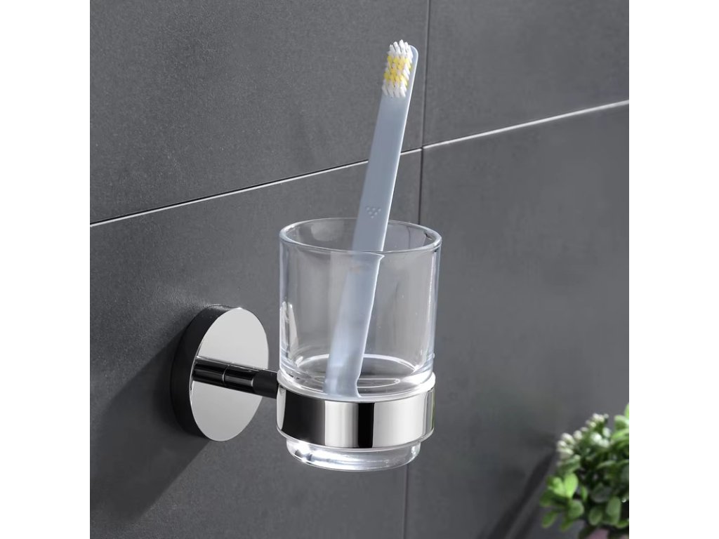 - Nástěnné držáky sklenic – možnosti pro uložení dvojice nebo jedné sklenice, ideální pro organizaci hygienických potřeb.