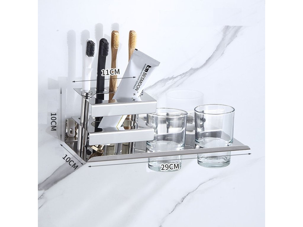 Disponuje držákem na dvě sklenice, které jsou součástí balení. Stojan na zubní kartáčky, zubní pastu, případně další kosmetiku udržuje všechny potřeby organizovaně na jednom místě.