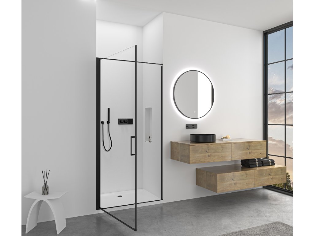 Dveře využívají křídlový systém otevírání, který je ideální pro moderní koupelny s dostatkem prostoru pro otevření dveřního křídla. Dveře jsou zavěšeny na zapuštěných pantech se systémem pneumatického přizvednutí.