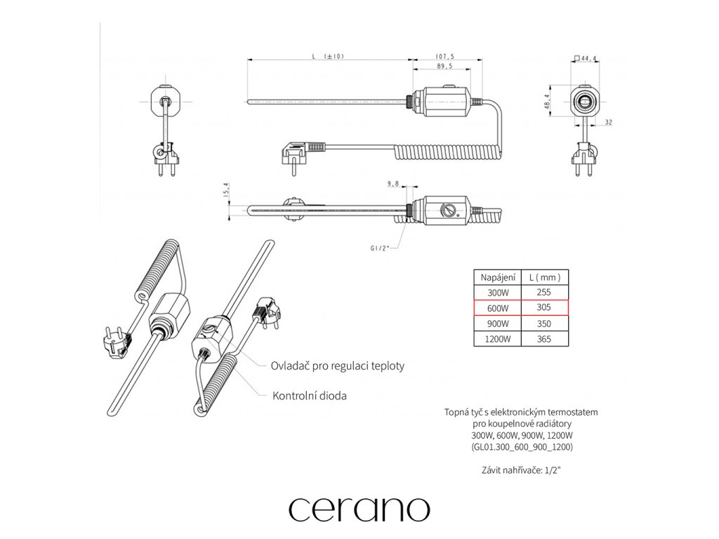 CERANO - Elektrická topná tyč s termostatem 600W - bílá lesklá