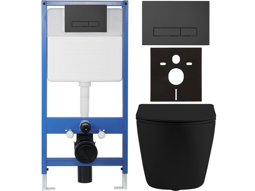 CERANO - Kompletní podomítkový WC set Lite/Cesso - černá matná - WC tlačítko Slim, černé matné - předstěnová instalace/sádrokarton - 49x36 cm