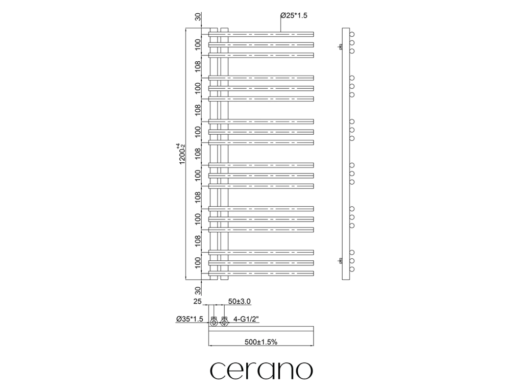 Standartní připojení radiátoru je 1/2" , což zajišťuje kompatibilitu s ventily a přípojnými sadami Cerano ,i od jiných výrobců. Ujistěte se, že všechny součásti odpovídají tomuto průměru, aby byl zajištěn bezpečný a efektivní provoz.