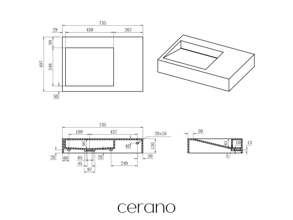 CERANO - Umyvadlo z litého mramoru Tokio - nástěnné - bílá matná - 73,5x49,7 cm