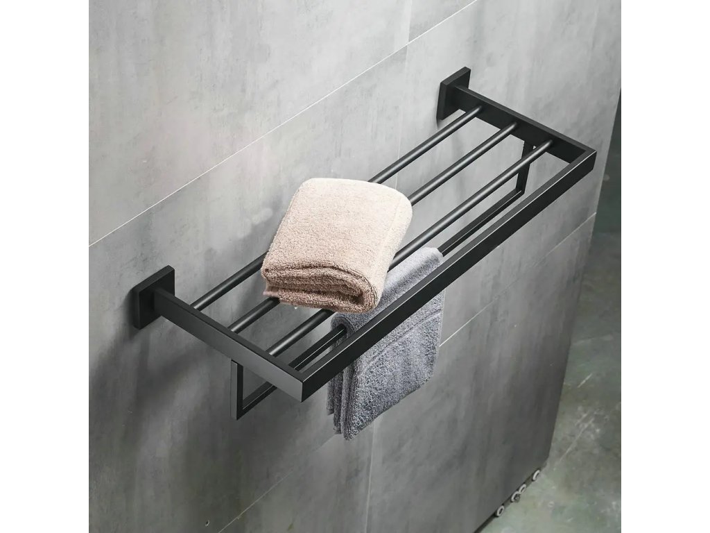 Horní strana slouží k umístění ručníků, ale praktické "šprušle" navíc nabízejí zavěšení ručníků pro potřebu sušení. Tato police je pevně upevněna ke stěně pomocí dvou malých montážních vrutů s hmoždinkami. Tento způsob montáže zajišťuje vyšší pevnost a nosnost celé police. Montážní sada je součástí balení.