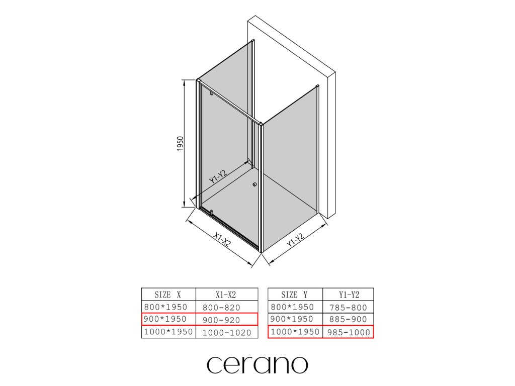 V rámci této série nabízíme širokou škálu rozměrů, abychom uspokojili různé potřeby našich zákazníků. Většina sprchových koutů, dveří a zástěn značky CERANO je navržena tak, aby byla kompatibilní se sprchovými vaničkami CERANO ve stejných rozměrech, což zajišťuje bezproblémovou instalaci a dokonalé sladění.