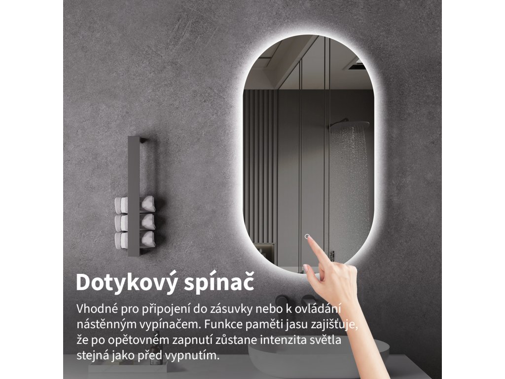 LED zrcadlo disponuje stmívačem, který umožňuje přesné nastavení intenzity osvětlení. Jednoduchým dotykem na senzorové pole světlo zapnete nebo vypnete. Podržením prstu upravíte jas podle potřeby – světlo plynule zesiluje nebo tlumí, aby vždy nabídlo ideální osvětlení přesně dle vašich požadavků.