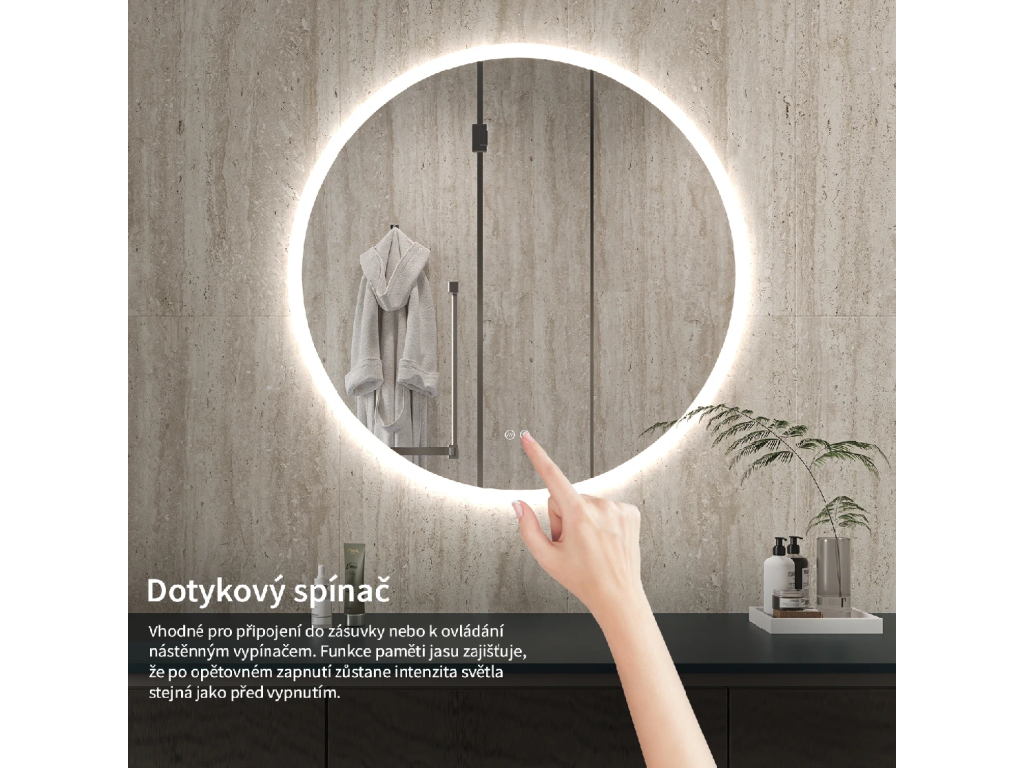 Osvětlení zrcadla lze snadno a pohodlně zapnout dotykem přepínače na panelu zrcadla. Umožňuje rychlé nastavení osvětlení bez nutnosti sahat po vzdálenějším tradičním vypínači.