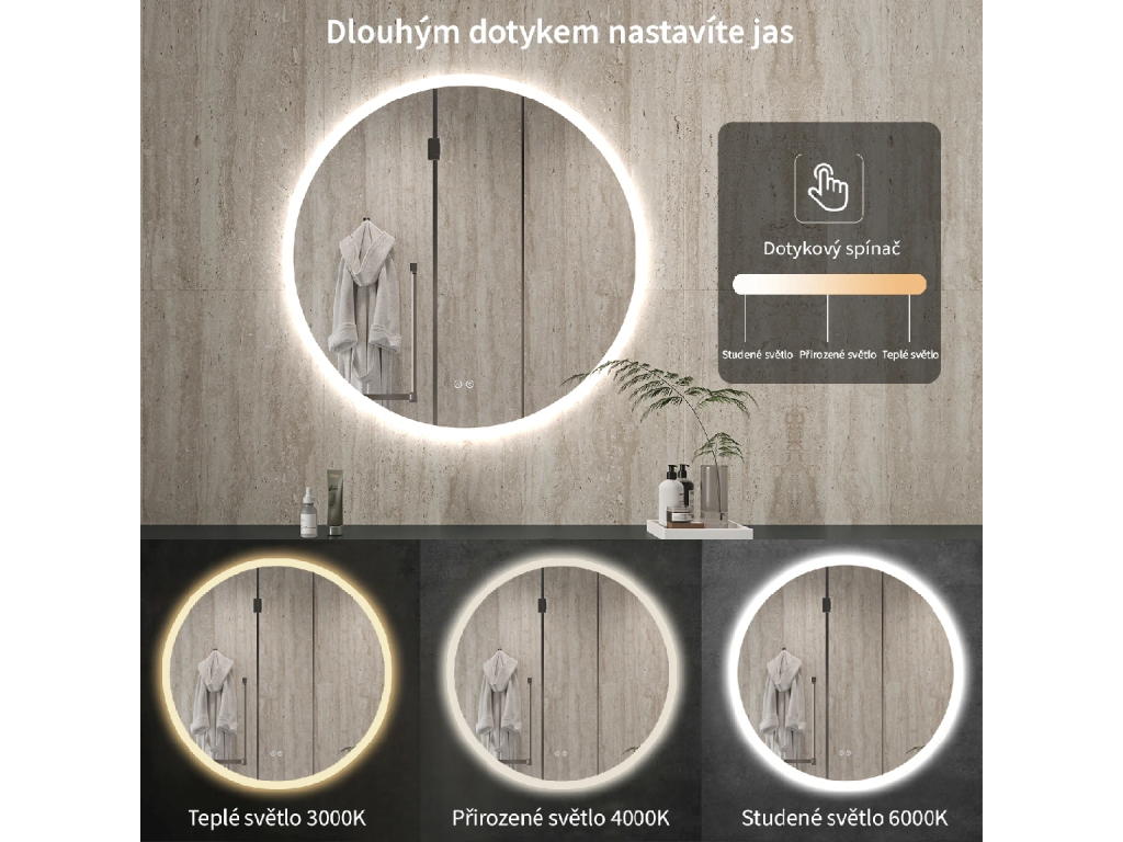 Zrcadlo je vybaveno LED osvětlením s nastavitelnou barvou světla – od 3000 K (teplá) do 6000 K (Neutrální). Přepínání barev jednoduše ovládáte dotykovým tlačítkem na ploše zrcadla. Poskytuje intenzivní a jasné světlo pro detailní péči i příjemné, jemné osvětlení pro relaxaci. Díky širokému rozsahu teploty barev tak snadno přizpůsobíte atmosféru aktuální potřebě.