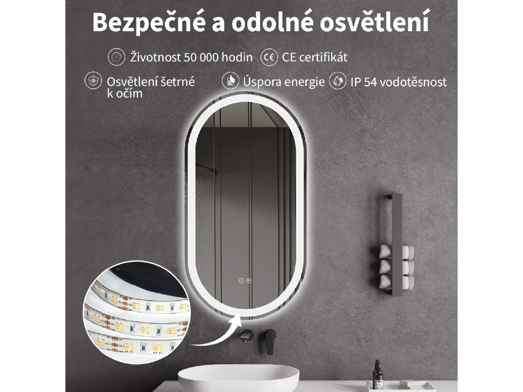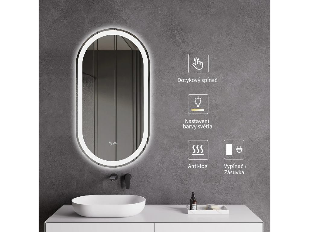 Zrcadlo je vybaveno LED osvětlením s nastavitelnou barvou světla – od 2800K (teplá) do 6000K (Neutrální). Poskytuje intenzivní a jasné osvětlení pro detailní péči i příjemné a jemné světlo pro relaxaci. Díky širokému rozsahu teploty barev lze přizpůsobit atmosféru dle potřeby.