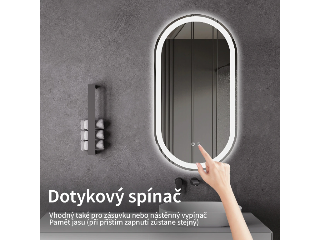 Osvětlení zrcadla lze snadno a pohodlně zapnout dotykem přepínače na panelu zrcadla. Umožňuje rychlé nastavení osvětlení bez nutnosti sahat po vzdálenějším tradičním vypínači.