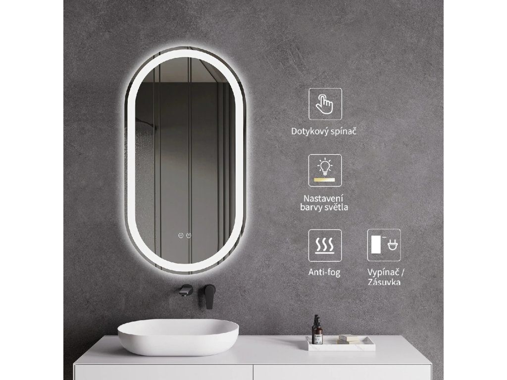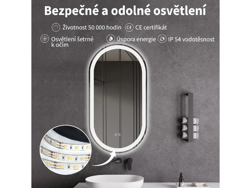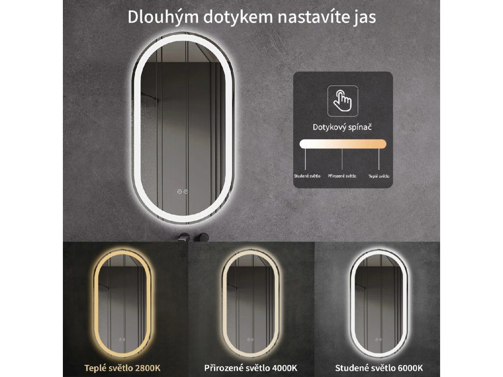 Zrcadlo je vybaveno LED osvětlením s nastavitelnou barvou světla – od 2800K (teplá) do 6000K (Neutrální). Poskytuje intenzivní a jasné osvětlení pro detailní péči i příjemné a jemné světlo pro relaxaci. Díky širokému rozsahu teploty barev lze přizpůsobit atmosféru dle potřeby.