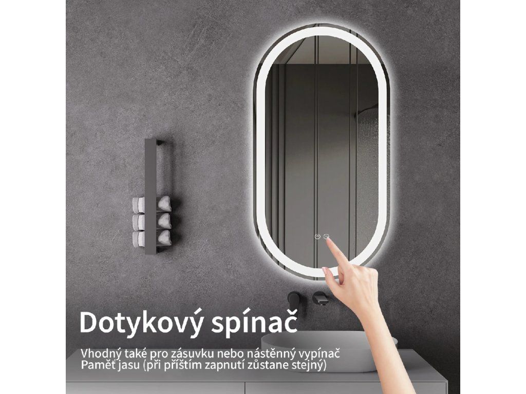 Osvětlení zrcadla lze snadno a pohodlně zapnout dotykem přepínače na panelu zrcadla. Umožňuje rychlé nastavení osvětlení bez nutnosti sahat po vzdálenějším tradičním vypínači.