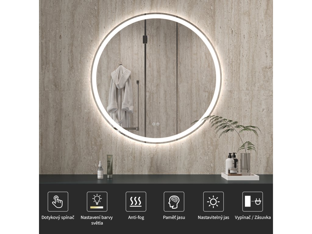 Zrcadlo je vybaveno LED osvětlením s nastavitelnou barvou světla – od 3000 K (teplá) do 6000 K (studená). Přepínání barev jednoduše ovládáte dotykovým tlačítkem na ploše zrcadla. Poskytuje intenzivní a jasné světlo pro detailní péči i příjemné, jemné osvětlení pro relaxaci. Díky širokému rozsahu teploty barev tak snadno přizpůsobíte atmosféru aktuální potřebě.