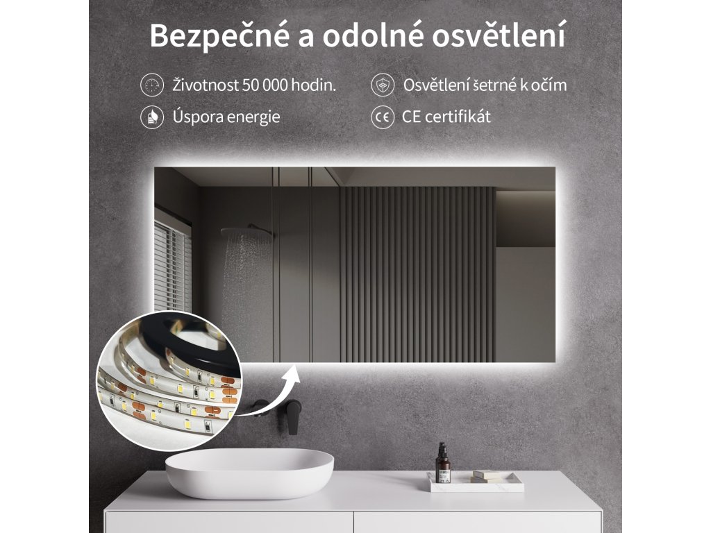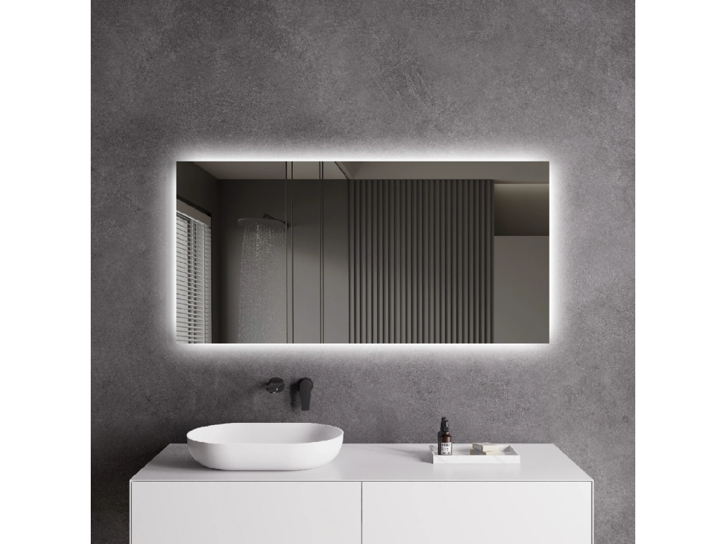 Zrcadlo je vybaveno zadním LED podsvícením, které svítí směrem ke stěně a vytváří jemný světelný efekt po celém obvodu. Rozptýlené světlo je vyzařováno z prostoru mezi rámem a zrcadlem, neoslňuje, zajišťuje rovnoměrné a příjemné nasvětlení prostoru koupelny.