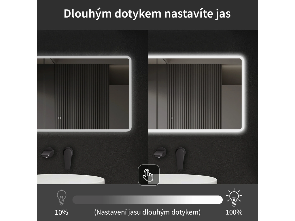 Osvětlení zrcadla lze snadno a pohodlně zapnout dotykem přepínače na panelu zrcadla. Umožňuje rychlé nastavení osvětlení bez nutnosti sahat po vzdálenějším tradičním vypínači.