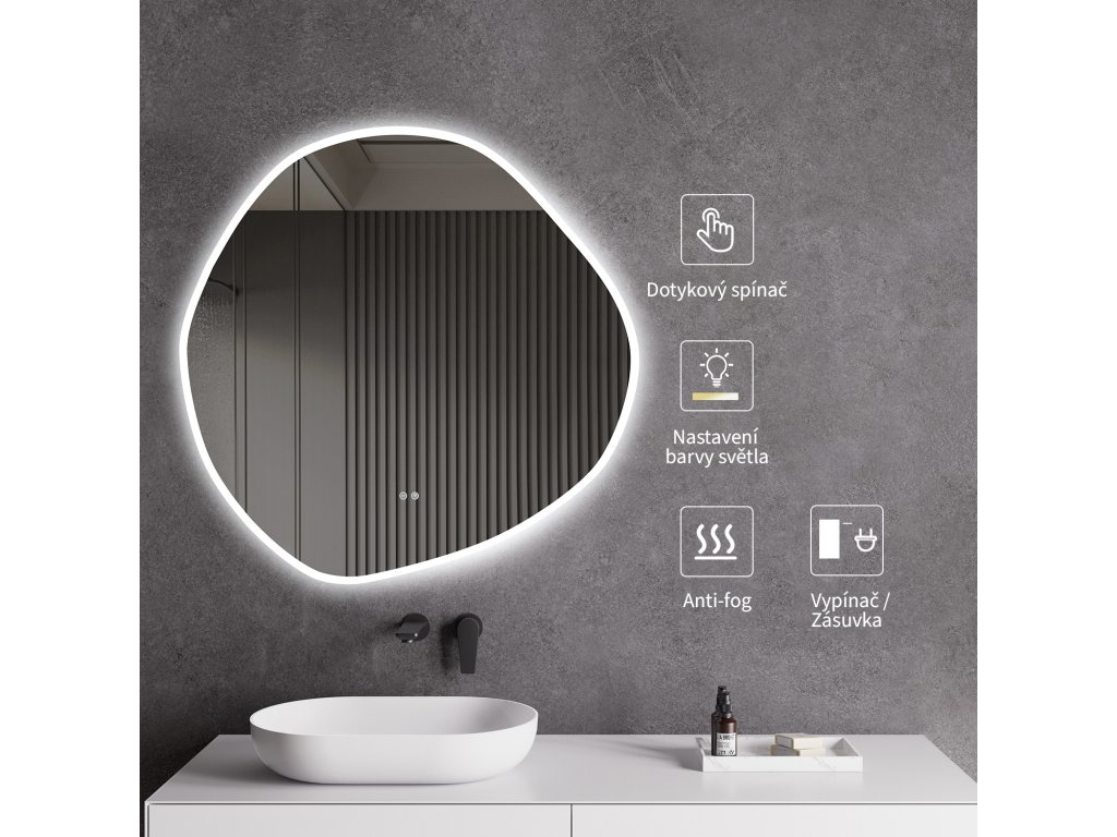 Zrcadlo je vybaveno LED osvětlením s nastavitelnou barvou světla – od 3000 K (teplá) do 6500 K (Neutrální). Přepínání barev jednoduše ovládáte dotykovým tlačítkem na ploše zrcadla. Poskytuje intenzivní a jasné světlo pro detailní péči i příjemné, jemné osvětlení pro relaxaci. Díky širokému rozsahu teploty barev tak snadno přizpůsobíte atmosféru aktuální potřebě.