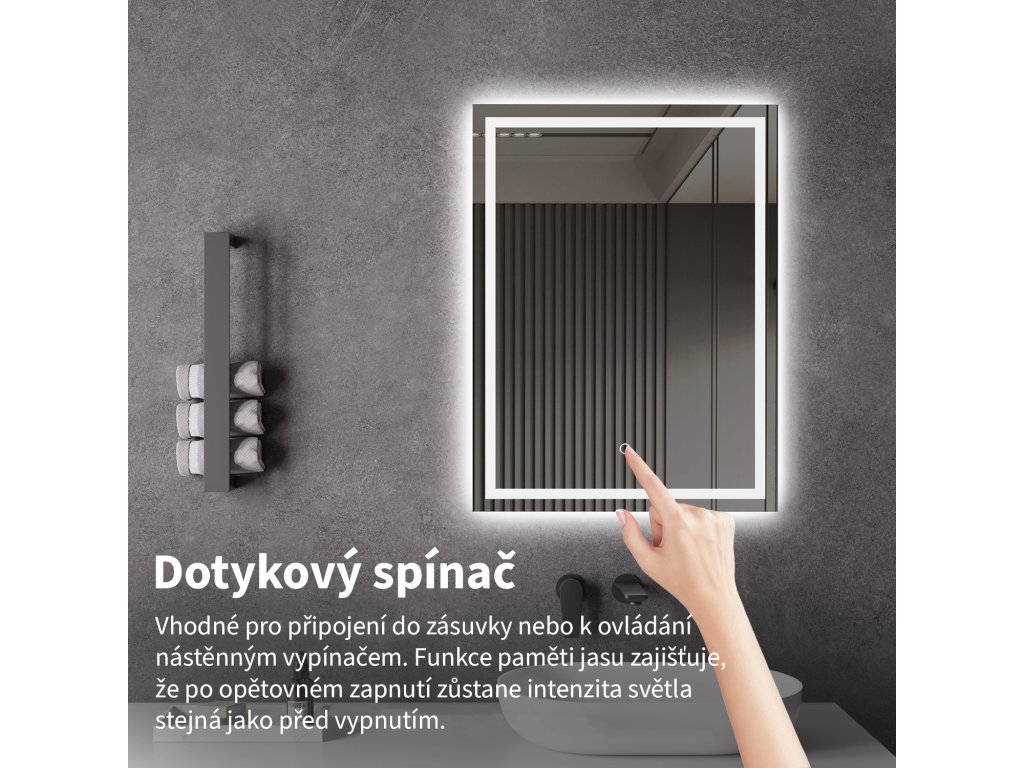 LED zrcadlo disponuje stmívačem, který umožňuje přesné nastavení intenzity osvětlení. Jednoduchým dotykem na senzorové pole světlo zapnete nebo vypnete. Podržením prstu upravíte jas podle potřeby – světlo plynule zesiluje nebo tlumí, aby vždy nabídlo ideální osvětlení přesně dle vašich požadavků.