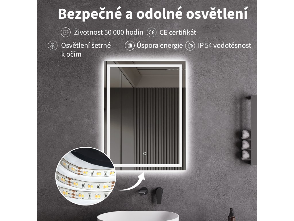 Zrcadlo je vybaveno LED osvětlením s nastavitelnou barvou světla – od 3000 K (teplá) do 6000 K (studená). Přepínání barev jednoduše ovládáte dotykovým tlačítkem na ploše zrcadla. Poskytuje intenzivní a jasné světlo pro detailní péči i příjemné, jemné osvětlení pro relaxaci. Díky širokému rozsahu teploty barev tak snadno přizpůsobíte atmosféru aktuální potřebě.