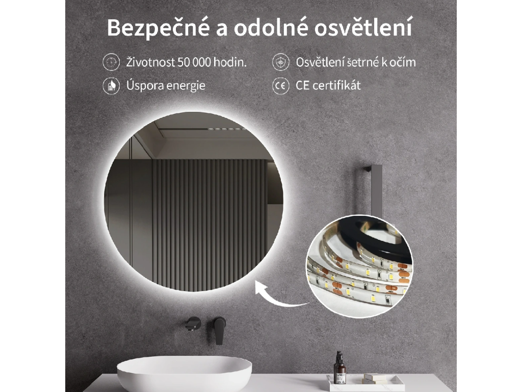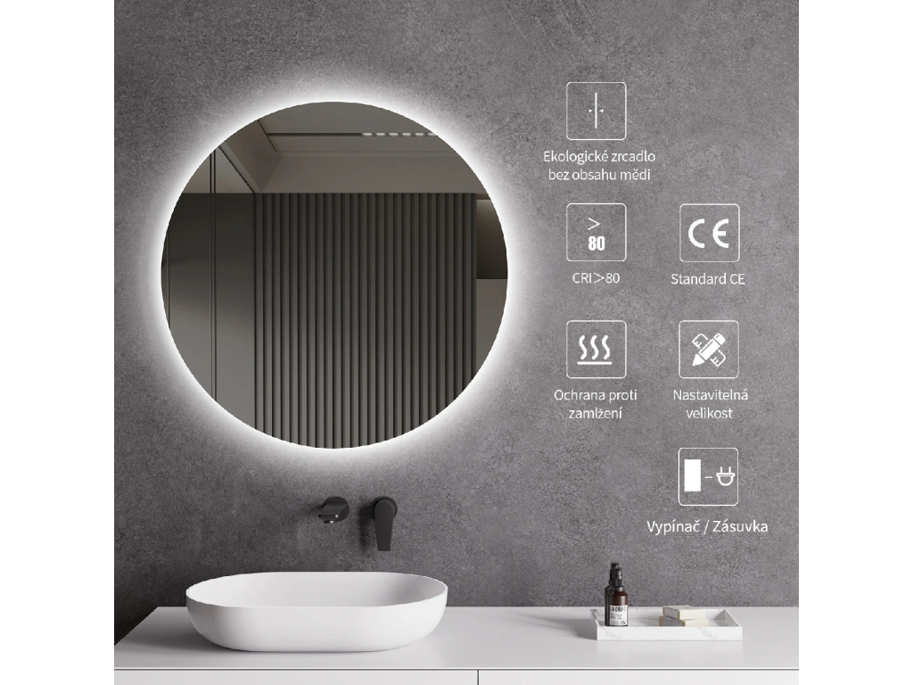Zrcadlo je vybaveno zadním LED podsvícením, které svítí směrem ke stěně a vytváří jemný světelný efekt po celém obvodu. Rozptýlené světlo je vyzařováno z prostoru mezi rámem a zrcadlem, neoslňuje, zajišťuje rovnoměrné a příjemné nasvětlení prostoru koupelny.