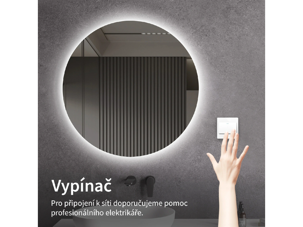 Osvětlení zrcadla lze zapnout skrze vypínač na zdi. Je nutné napojit jej přímo na domácí elektrickou síť. Před instalací doporučujeme obrátit se na kvalifikovaného elektrikáře, který zajistí správné a bezpečné připojení.