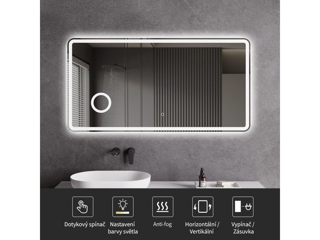Osvětlení zrcadla lze snadno a pohodlně zapnout dotykem přepínače na panelu zrcadla. Umožňuje rychlé nastavení osvětlení bez nutnosti sahat po vzdálenějším tradičním vypínači.