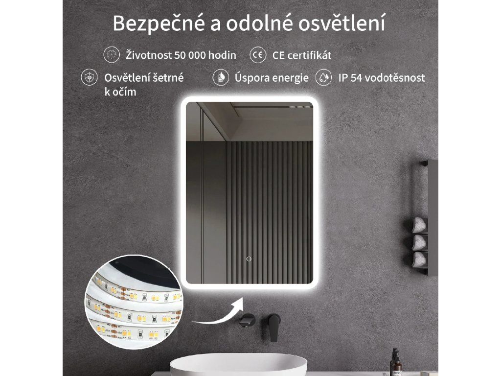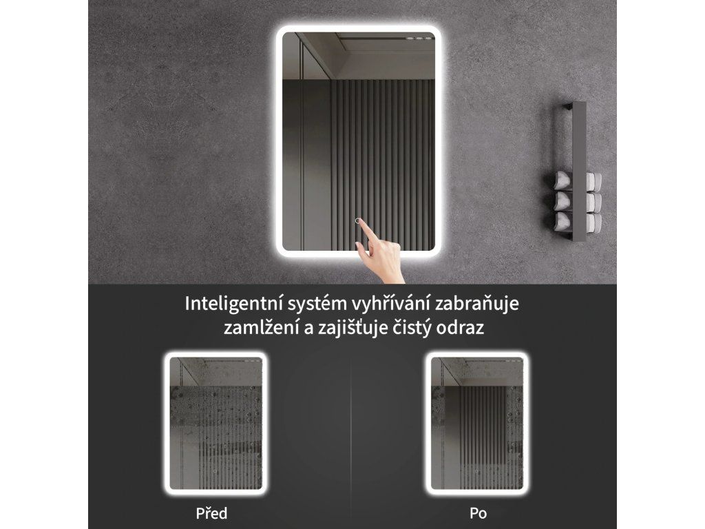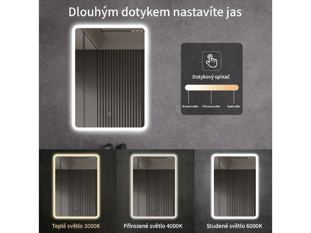 Zrcadlo je vybaveno LED osvětlením s nastavitelnou barvou světla – od 3000 K (teplá) do 6000 K (Neutrální). Přepínání barev jednoduše ovládáte dotykovým tlačítkem na ploše zrcadla. Poskytuje intenzivní a jasné světlo pro detailní péči i příjemné, jemné osvětlení pro relaxaci. Díky širokému rozsahu teploty barev tak snadno přizpůsobíte atmosféru aktuální potřebě.