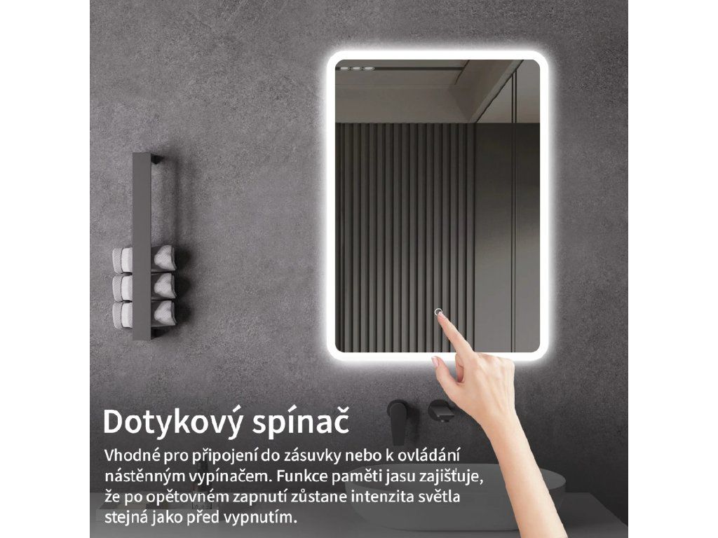 Osvětlení zrcadla lze snadno a pohodlně zapnout dotykem přepínače na panelu zrcadla. Umožňuje rychlé nastavení osvětlení bez nutnosti sahat po vzdálenějším tradičním vypínači.