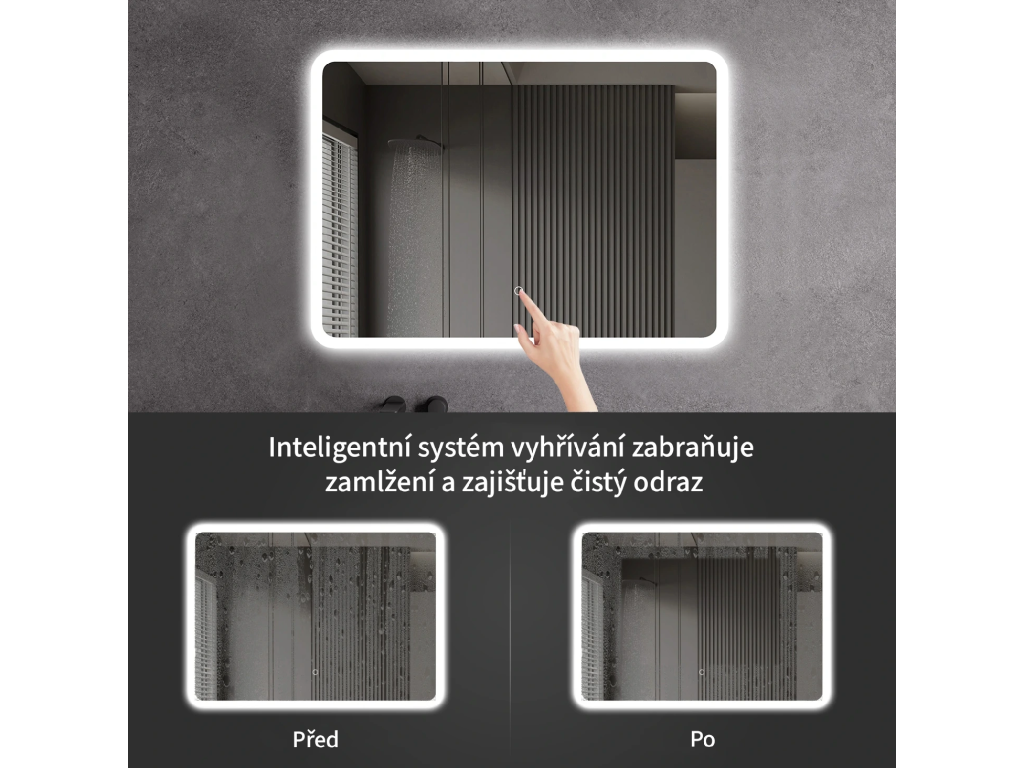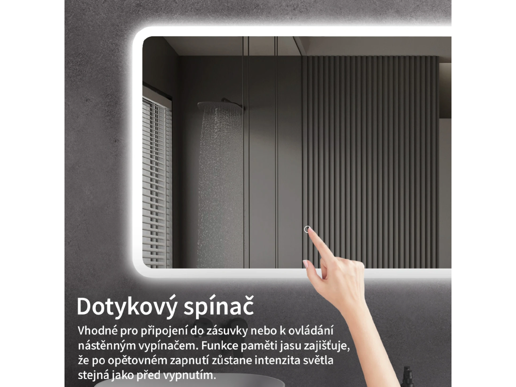 Osvětlení zrcadla lze snadno a pohodlně zapnout dotykem přepínače na panelu zrcadla. Umožňuje rychlé nastavení osvětlení bez nutnosti sahat po vzdálenějším tradičním vypínači.