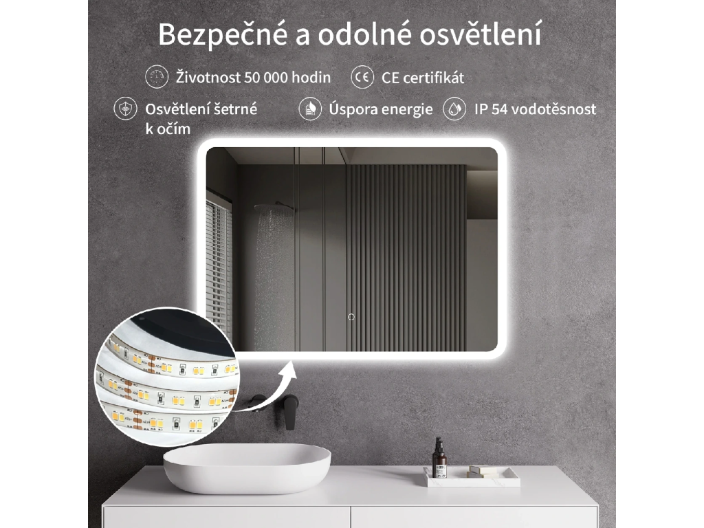 LED osvětlení u koupelnových zrcadel přináší řadu výhod: nižší provozní náklady, vyšší účinnost a krytí IP, menší tepelné vyzařování, delší životnost, možnost stmívání, volbu teploty chromatičnosti a různé varianty podsvícení – po obvodu, za zrcadlem nebo bodově.