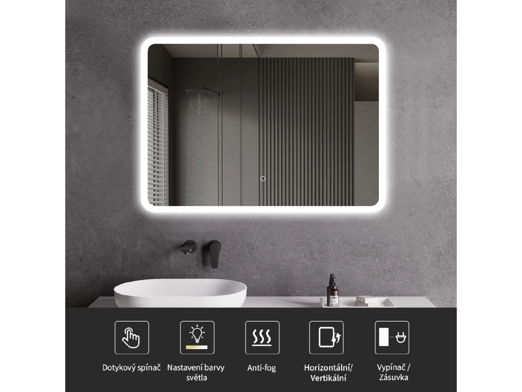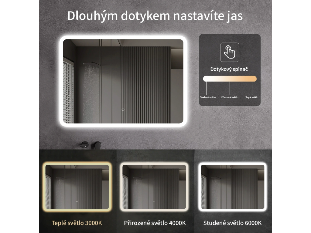Zrcadlo je vybaveno LED osvětlením s nastavitelnou barvou světla – od 3000 K (teplá) do 6000 K (Neutrální). Přepínání barev jednoduše ovládáte dotykovým tlačítkem na ploše zrcadla. Poskytuje intenzivní a jasné světlo pro detailní péči i příjemné, jemné osvětlení pro relaxaci. Díky širokému rozsahu teploty barev tak snadno přizpůsobíte atmosféru aktuální potřebě.