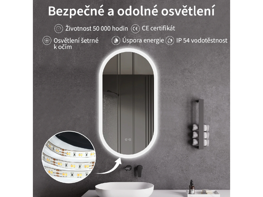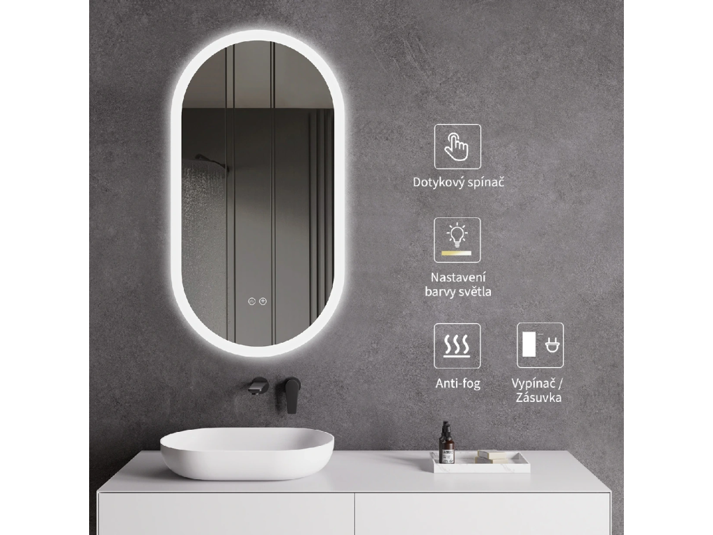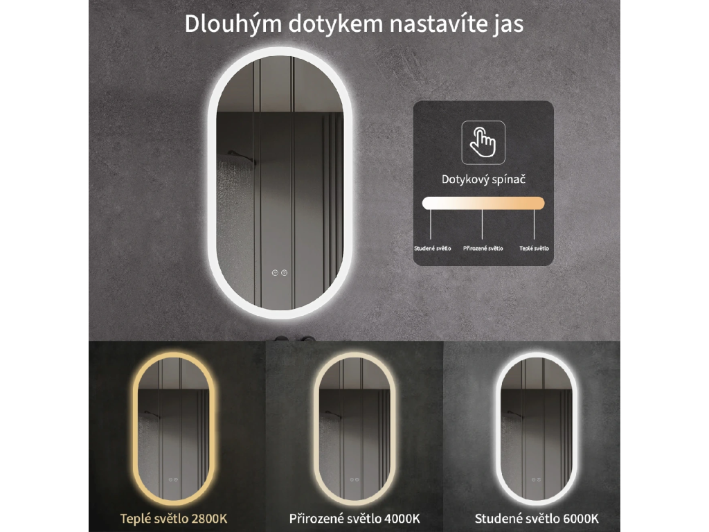 Zrcadlo je vybaveno LED osvětlením s nastavitelnou barvou světla – od 2800K (teplá) do 6000K (Neutrální). Poskytuje intenzivní a jasné osvětlení pro detailní péči i příjemné a jemné světlo pro relaxaci. Díky širokému rozsahu teploty barev lze přizpůsobit atmosféru dle potřeby.