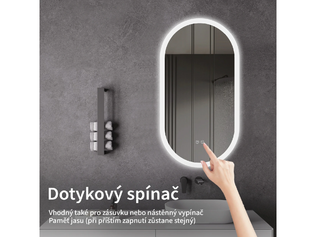 Osvětlení zrcadla lze snadno a pohodlně zapnout dotykem přepínače na panelu zrcadla. Umožňuje rychlé nastavení osvětlení bez nutnosti sahat po vzdálenějším tradičním vypínači.