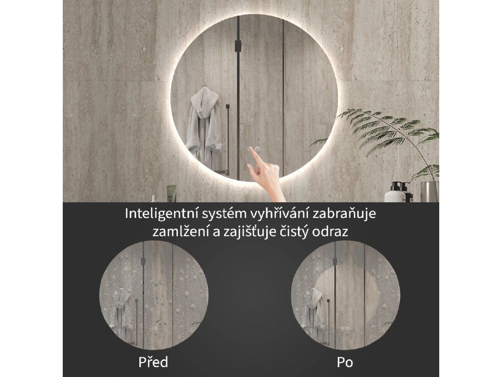 Zrcadlo je vybaveno LED osvětlením s nastavitelnou barvou světla – od 3000 K (teplá) do 6000 K (Neutrální). Přepínání barev jednoduše ovládáte dotykovým tlačítkem na ploše zrcadla. Poskytuje intenzivní a jasné světlo pro detailní péči i příjemné, jemné osvětlení pro relaxaci. Díky širokému rozsahu teploty barev tak snadno přizpůsobíte atmosféru aktuální potřebě.