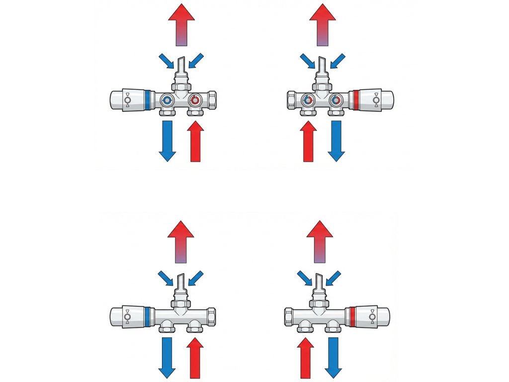 Jedná se o sadu pro dolní připojení radiátoru, která obsahuje úhlové prvky pro levou/pravou stranu a rovné prvky pro levou/pravou stranu. Tato sada umožňuje také použití elektrického topného tělesa v konfiguraci s radiátorem.