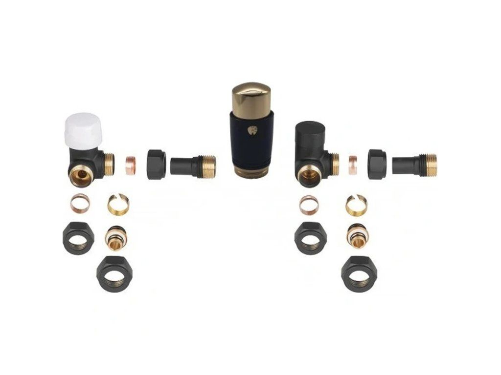 CERANO - Připojovací sada radiátorového ventilu s termostatickou hlavicí - rohová - černá matná/zlatá