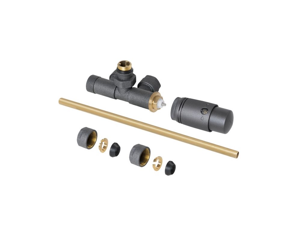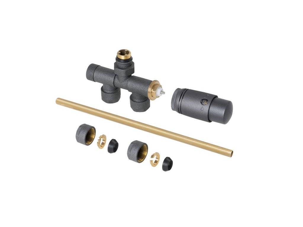 Jedná se o sadu pro dolní připojení radiátoru, která obsahuje úhlové prvky pro levou/pravou stranu a rovné prvky pro levou/pravou stranu. Tato sada umožňuje také použití elektrického topného tělesa v konfiguraci s radiátorem.