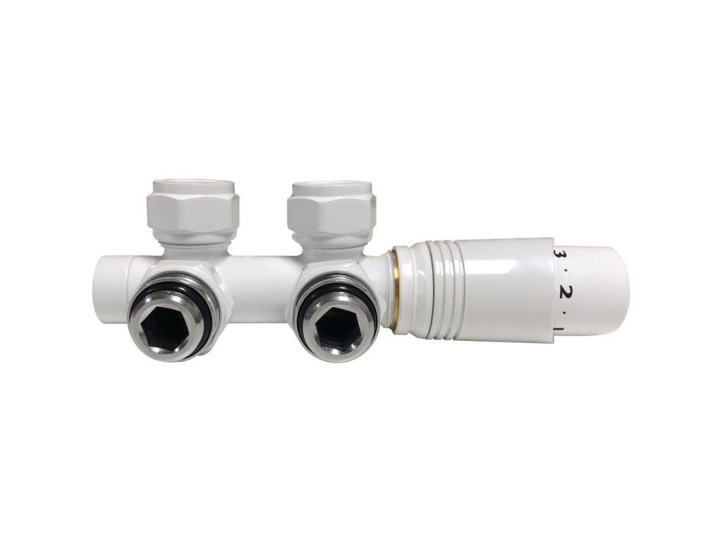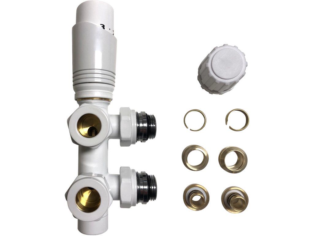- Spojuje přívod a zpátečku (tedy oba otvory radiátoru) do jednoho kompaktního kusu.
