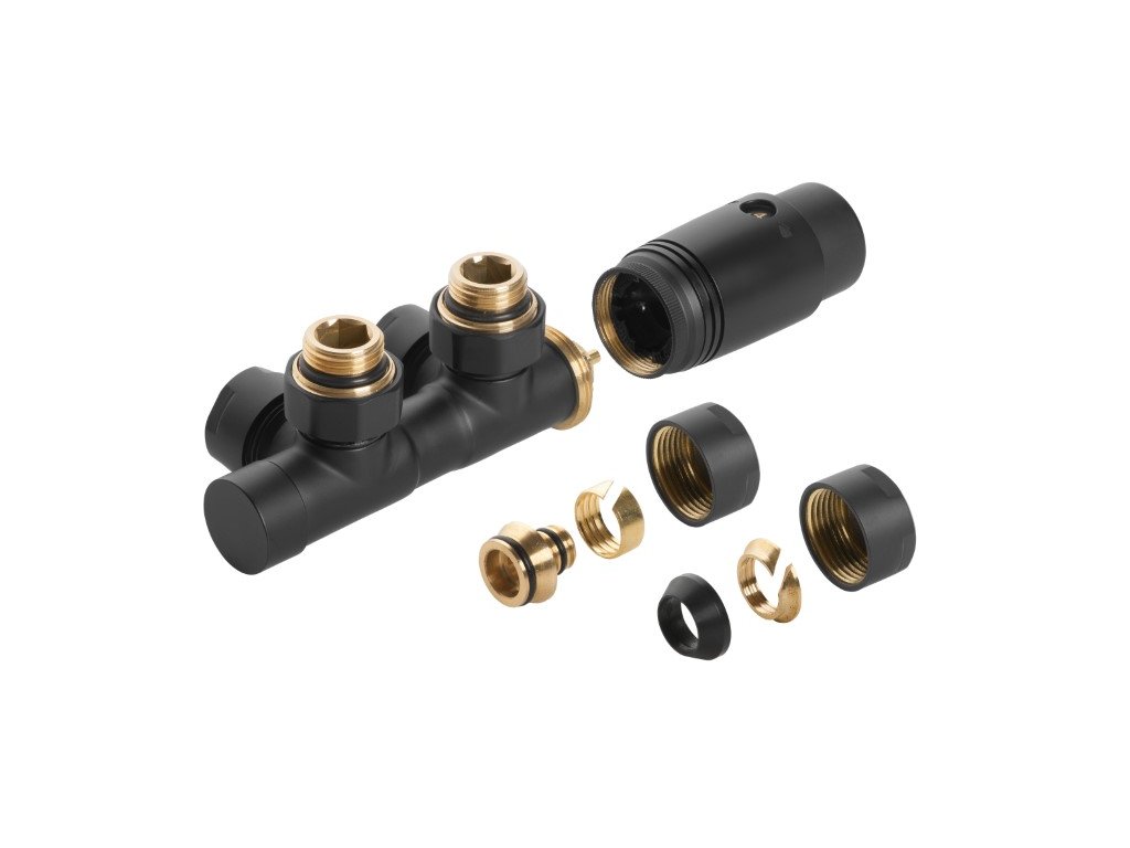- Spojuje přívod a zpátečku (tedy oba otvory radiátoru) do jednoho kompaktního kusu.