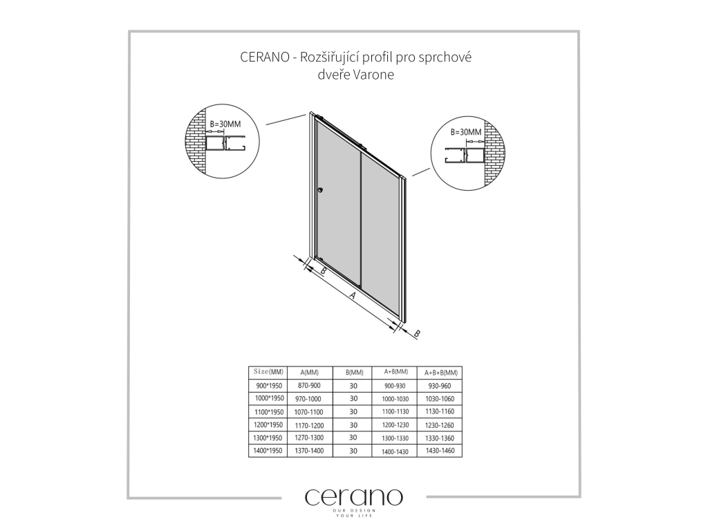 Tento rozšiřující profil značky Cerano je navržen pro snadné přizpůsobení sprchových dveří VARONE do širších stavebních otvorů.