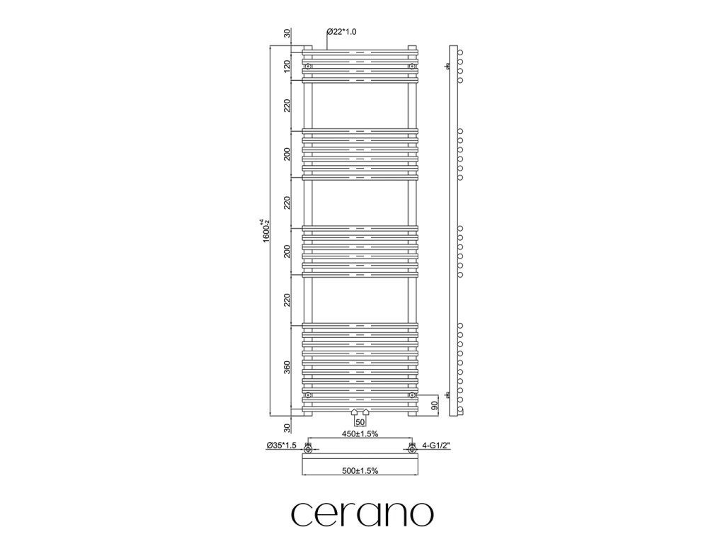 Standartní připojení radiátoru je 1/2" , což zajišťuje kompatibilitu s ventily a přípojnými sadami Cerano ,i od jiných výrobců. Ujistěte se, že všechny součásti odpovídají tomuto průměru, aby byl zajištěn bezpečný a efektivní provoz.