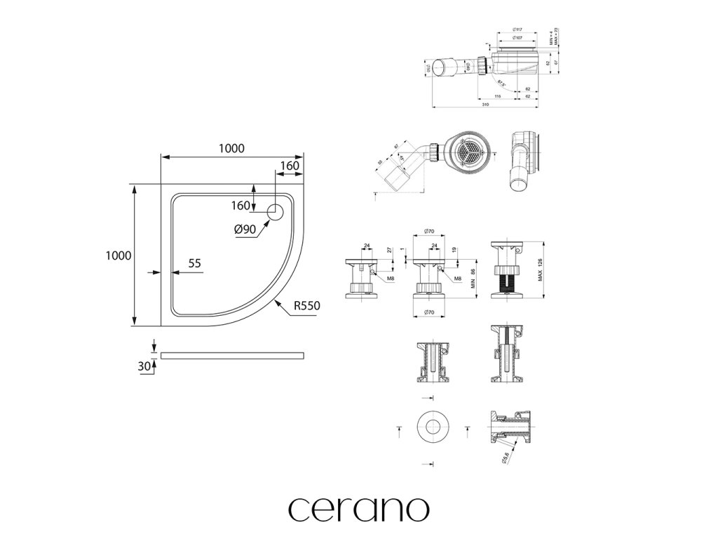 CERANO - Sprchový vaničkový set Piato - litý mramor - bílá lesklá - 100x100 cm + nožičky + sifon sprch.vaničky
