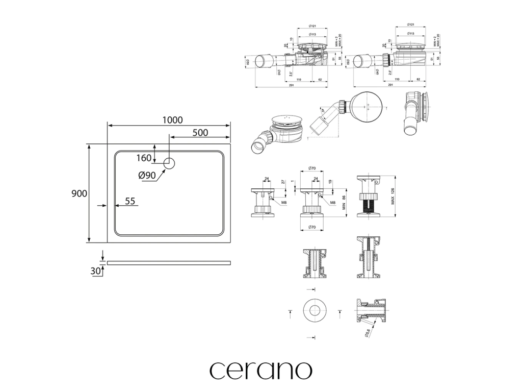 CERANO - Sprchový vaničkový set Piato - litý mramor - bílá lesklá - 100x90 cm + nožičky + sifon sprch.vaničky