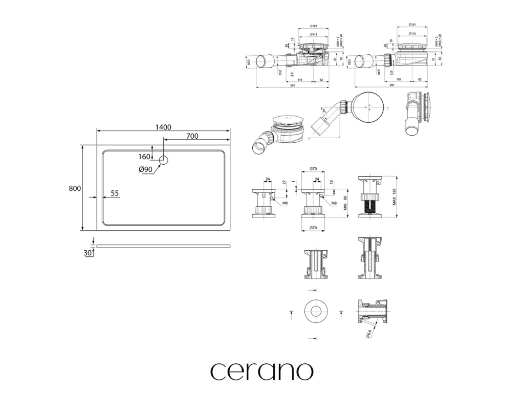 CERANO - Sprchový vaničkový set Piato - litý mramor - bílá lesklá - 140x80 cm + nožičky + sifon sprch.vaničky