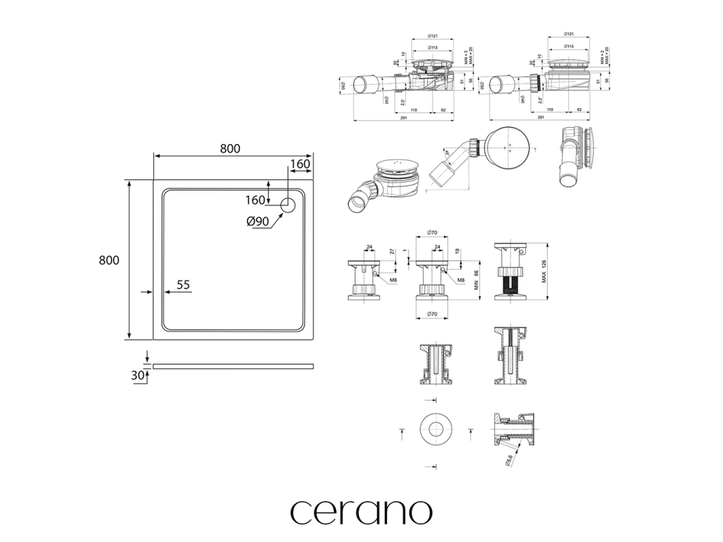 CERANO - Sprchový vaničkový set Piato - litý mramor - bílá lesklá - 80x80 cm + nožičky + sifon sprch.vaničky