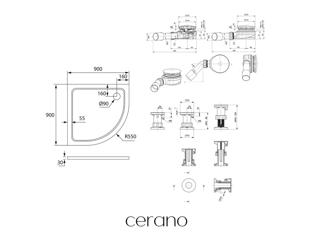 CERANO - Sprchový vaničkový set Piato - litý mramor - bílá lesklá - 90x90 cm + nožičky + sifon sprch.vaničky