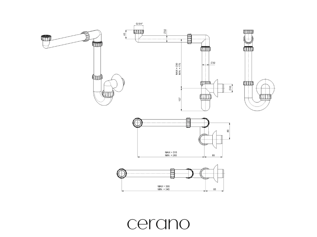 CERANO - Sifon umyvadlový/nábytkový, místošetřící - DN32/250-700 mm - s výpustí click-clack s přepadem - plast - 67/82mm - bílá lesklá