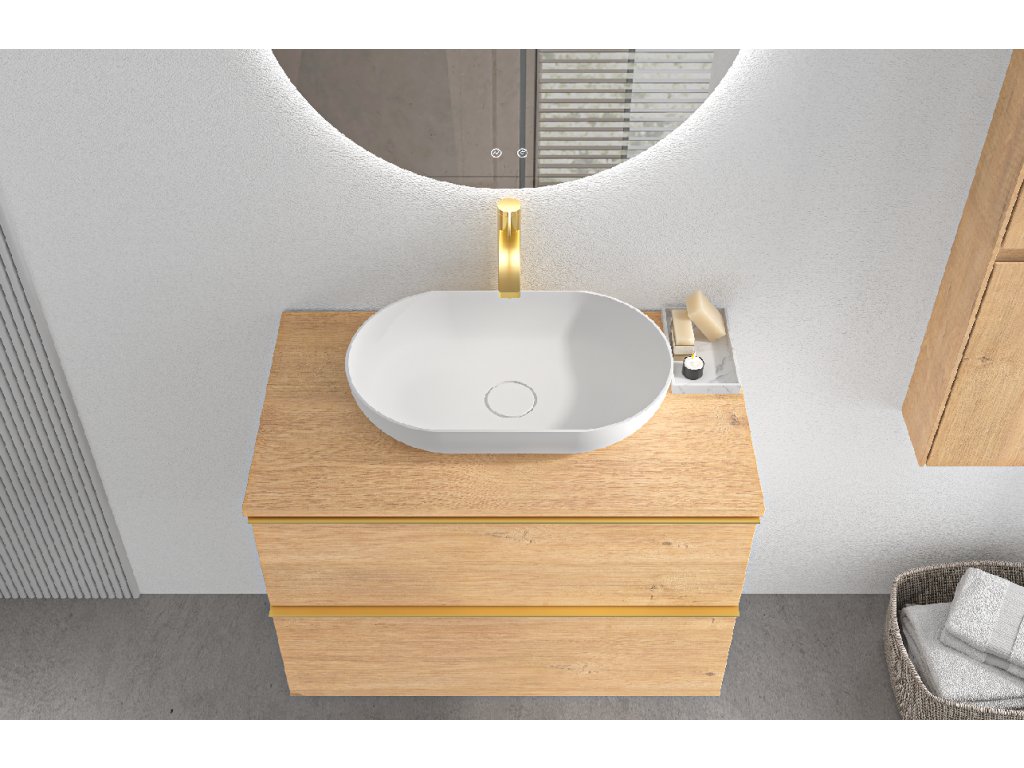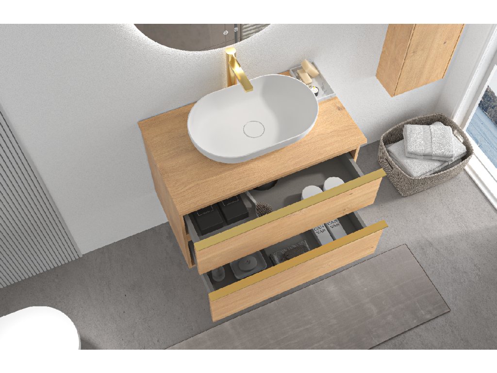Koupelnové skříňky jsou vyrobeny z MDF lamina (středně hustá dřevovláknitá deska) s nalisovanou melaminovou fólií, která je odolná vůči vlhkosti, poškrábání, UV záření a běžným čisticím prostředkům. Povrch je hladký, tvrdý, homogenní a snadno se čistí. MDF desky se nekroutí jako masivní dřevo. Pokud dojde k mechanickému narušení laminace, samotné MDF jádro může navlhnout.
