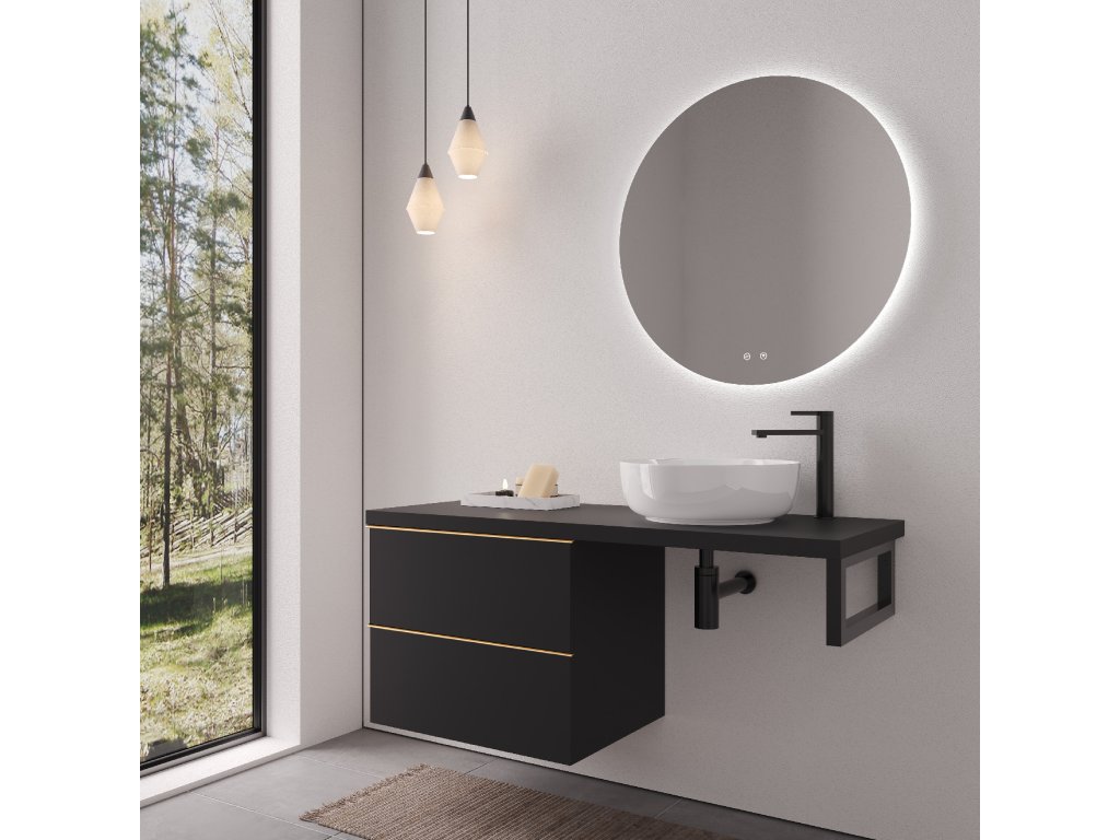 CERANO - Deska pod umyvadlo Navira Pro - 161x46,5x3,6 cm - skříňka Velora 79 cm - černá matná, zlatá úchytka - konzole černá