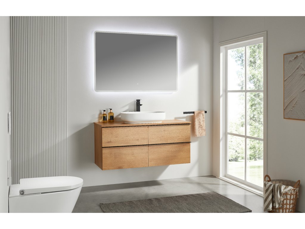 Koupelnové skříňky jsou vyrobeny z MDF lamina (středně hustá dřevovláknitá deska) s nalisovanou melaminovou fólií, která je odolná vůči vlhkosti, poškrábání, UV záření a běžným čisticím prostředkům. Povrch je hladký, tvrdý, homogenní a snadno se čistí. MDF desky se nekroutí jako masivní dřevo. Pokud dojde k mechanickému narušení laminace, samotné MDF jádro může navlhnout.