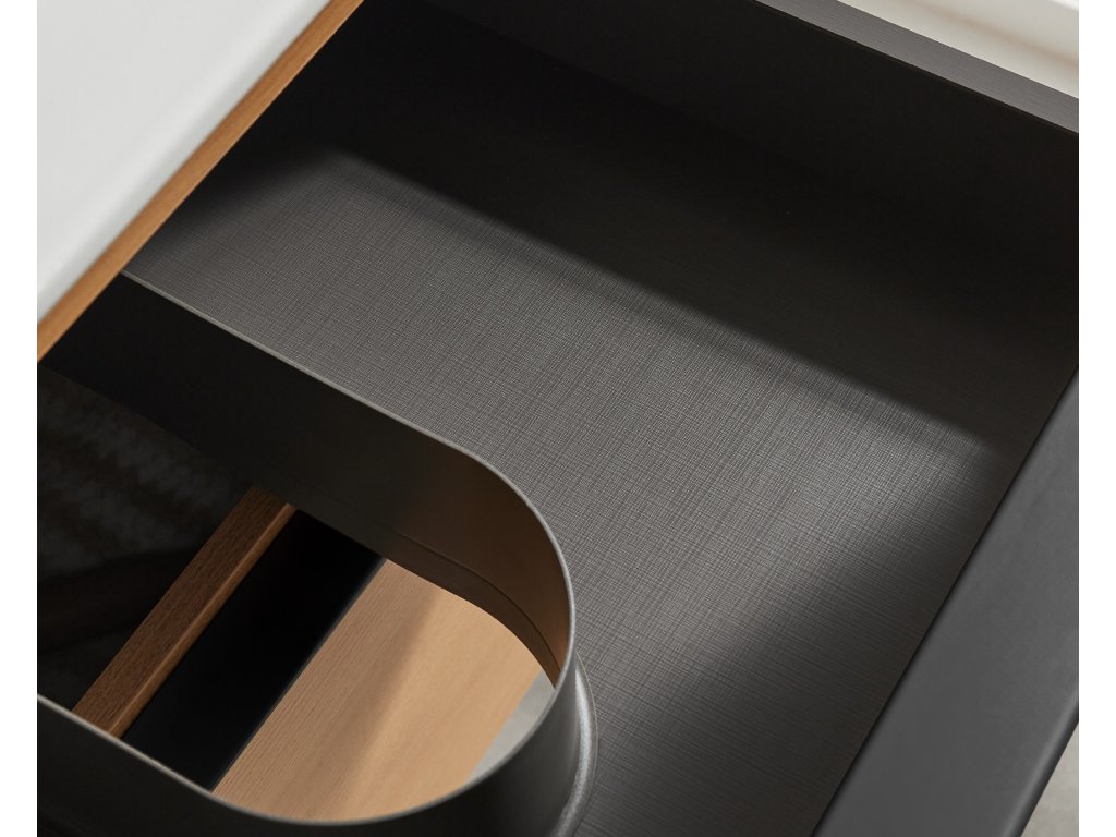 Zásuvka je osazena mechanismem soft-close, který kombinuje tlumicí jednotku a pružinový systém pro řízené dovírání. Při zavírání dochází k automatickému zpomalení pohybu a následnému tichému dotažení zásuvky do koncové polohy. Mechanismus zabraňuje nárazu, prodlužuje životnost zásuvky a zajišťuje vyšší uživatelský komfort.